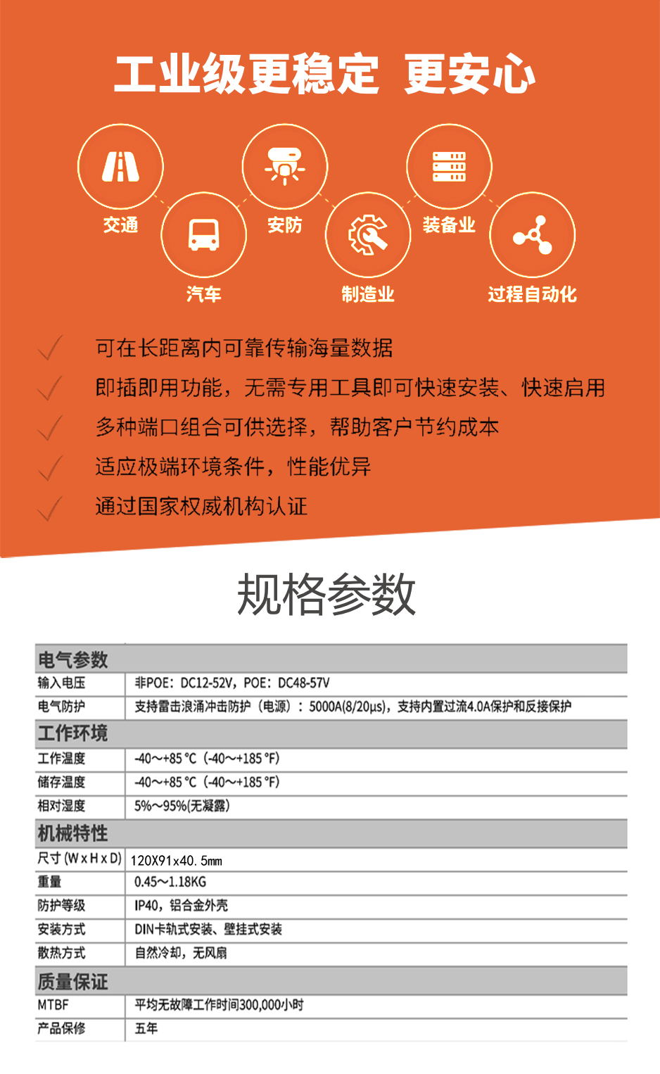 工業級(NT品牌)非網管1百光2百電,SFP接口,導軌式-DC12~52V供電-寬溫(-40℃-85℃)。默認不含AC電源適配器和不含光模塊。 |