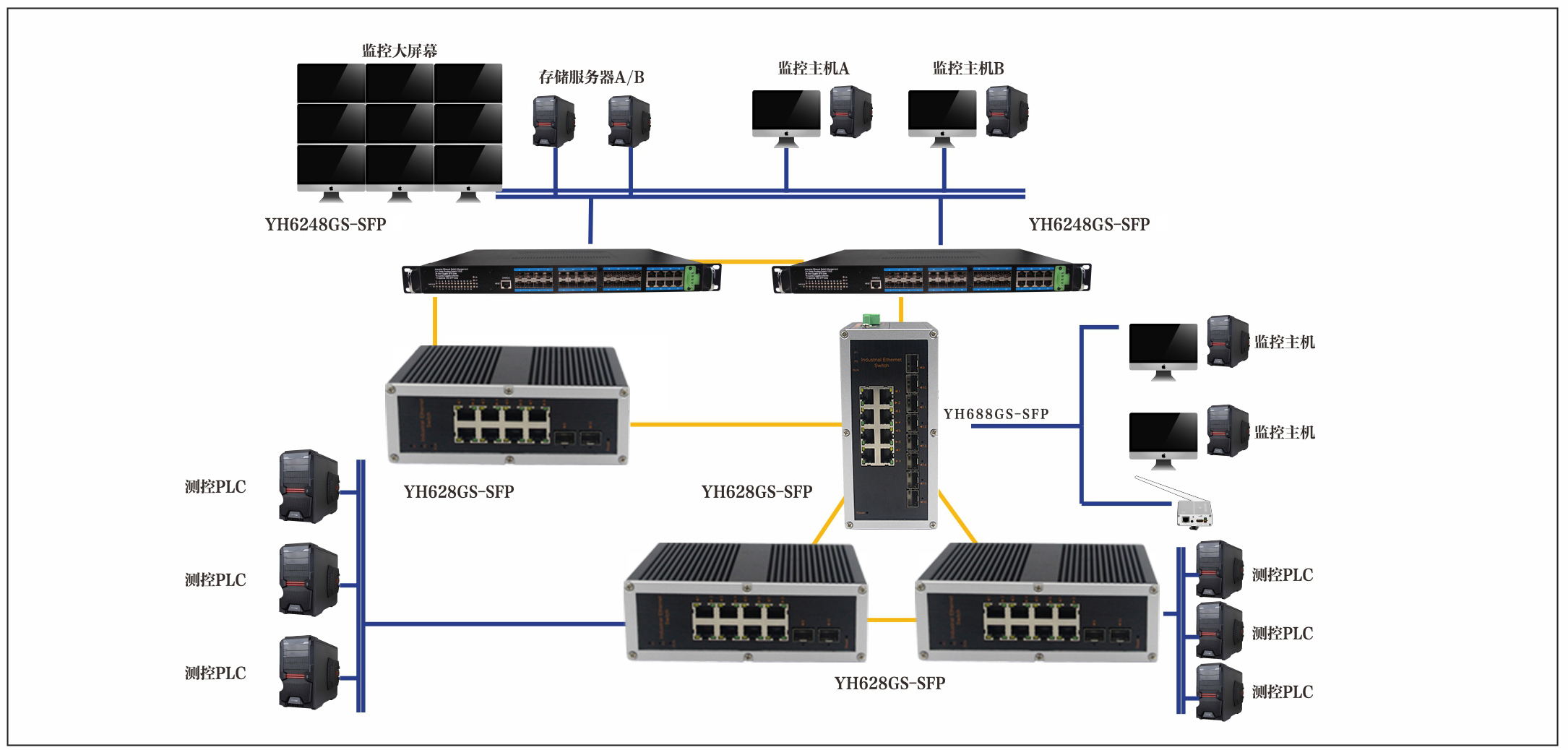 宇航在軌道交通設備監(jiān)控系統(tǒng)解決方案中采用了YH6248G4TS-SFP,YH628GS-SFP,YH688GS-SFP環(huán)境與設備采集系統(tǒng)通過現(xiàn)場控制器PLC設備來控制通風系統(tǒng),并與空調系統(tǒng)給排水系統(tǒng),照明系統(tǒng),自動扶梯系統(tǒng),導向系統(tǒng),屏蔽門/安全門系統(tǒng),并通過主設備雙交換機將數據上傳至線路中心控制工作站服務器監(jiān)控,同時通過骨干環(huán)網線路上傳至線路中心,BAS控制系統(tǒng)同步監(jiān)控。通過主設備雙交換機將BAS工作站及車站服務器等系統(tǒng)接入設備與車站骨干網絡冗余互聯(lián)。 維修與備用中心采用環(huán)網交換機進行環(huán)網冗余連接,線路中心BAS系統(tǒng)采用核心交換機主設備連接模式與核心交換機機相連。